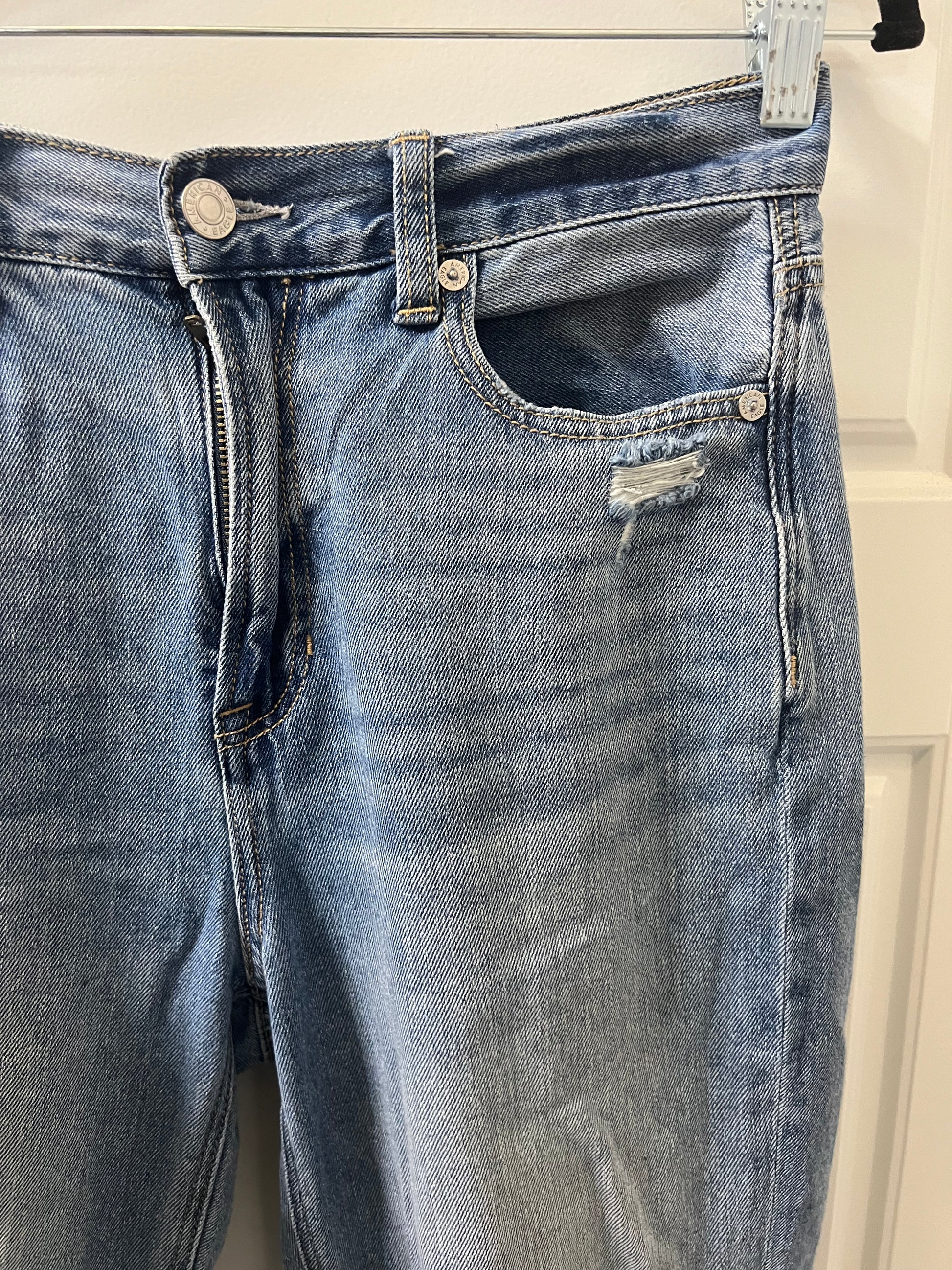 - Wash & Distressing: The jeans boast a light blue wash, giving them a vintage-inspired look, and are significantly distressed with prominent rips at both knees and additional subtle distressing or whiskering throughout the denim.