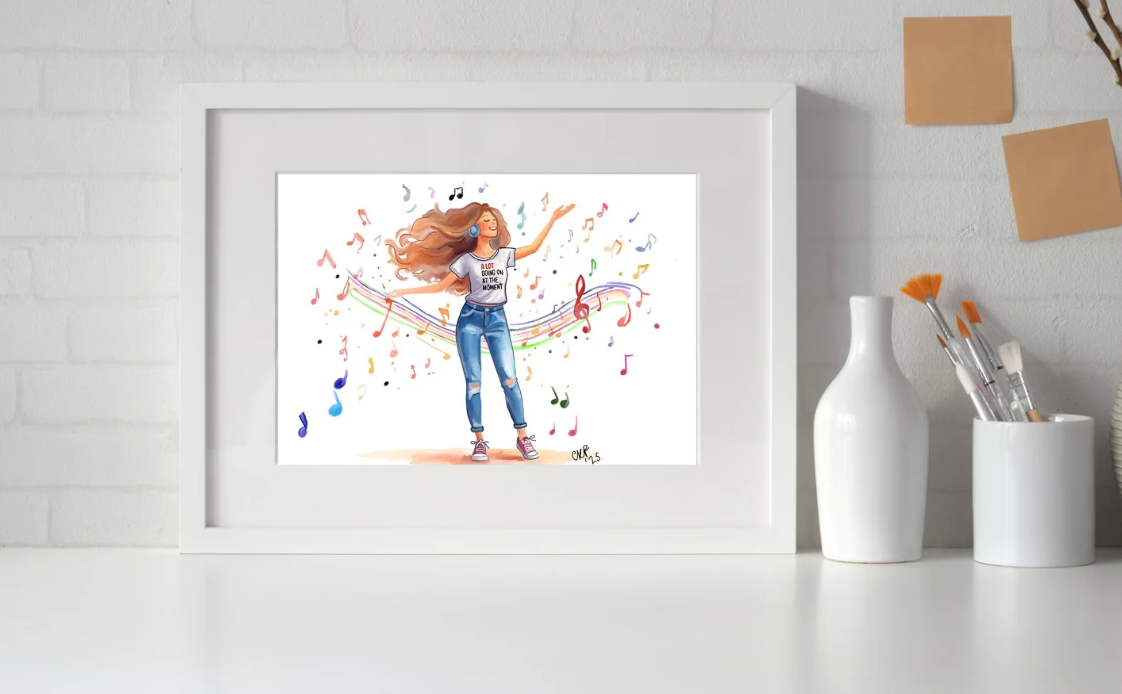 Let the rhythm take over with this joyful and empowering art print, featuring a confident young woman immersed in music, surrounded by a flurry of colorful notes and vibrant movement.