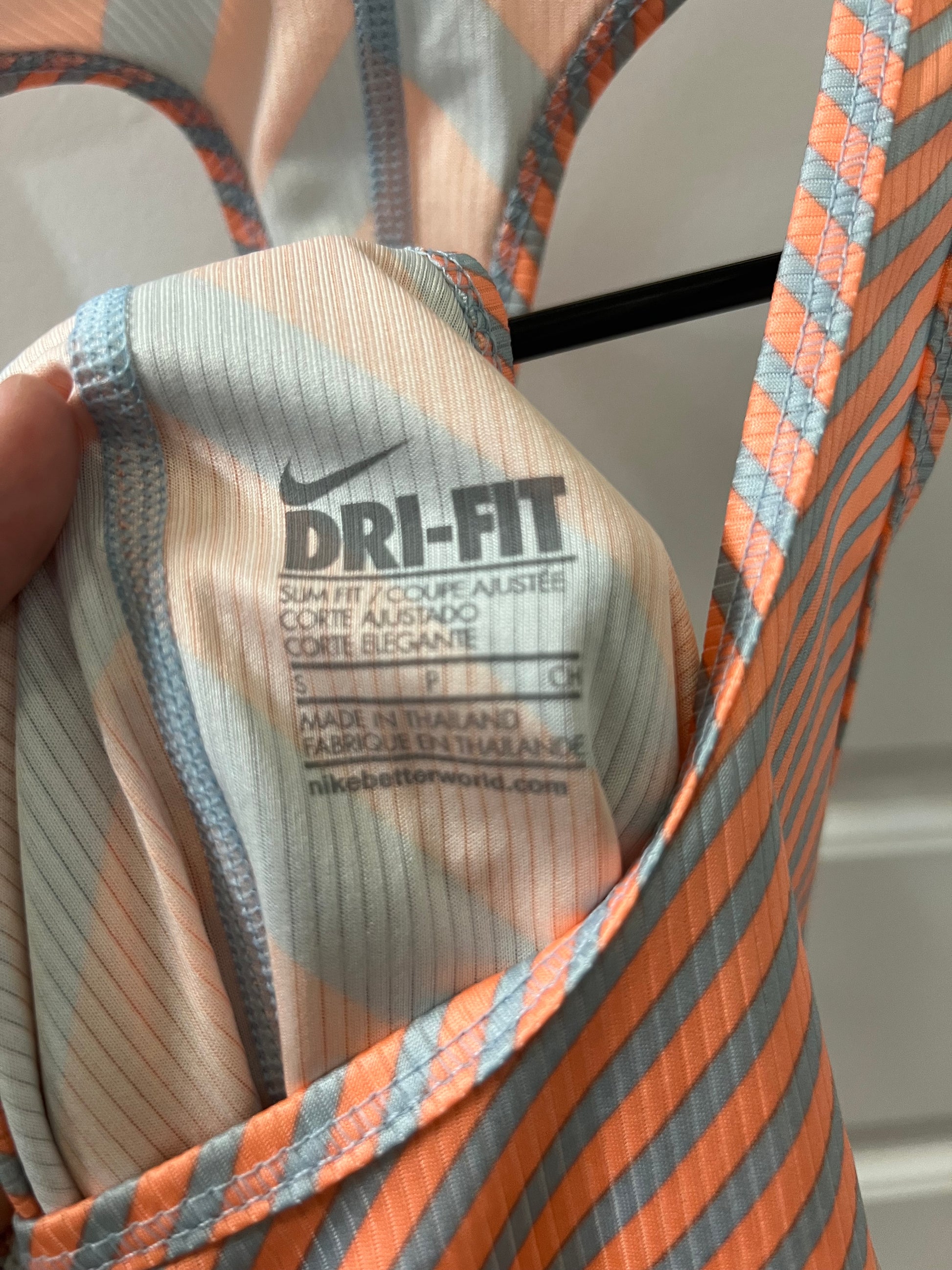 - Appearance: The specific tank top in the image features a distinctive pattern of orange and grey stripes, providing a stylish element to its athletic functionality.